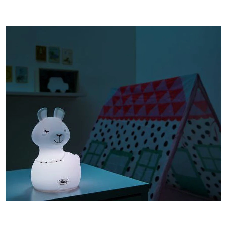 Realizzata in materiale morbido, la lampada da notte Lama di Chicco può essere abbracciata e coccolata anche dai più piccoli.