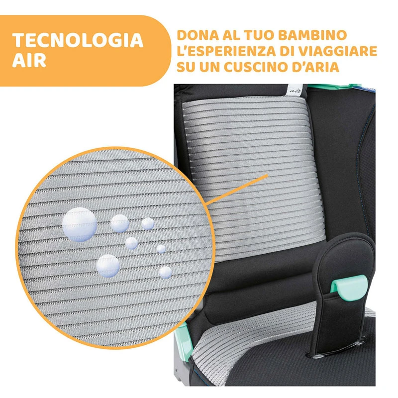 - Tessuti in rete 3D che assicurano un’elevata traspirabilità all’interno del seggiolino