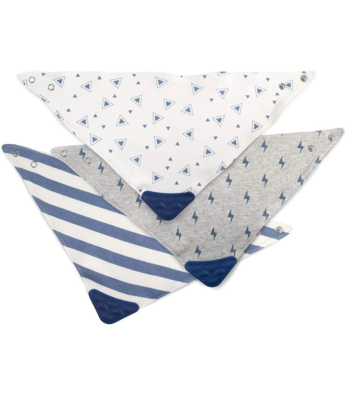 3 bavaglini a bandana colore blu, diverse fantasie con chiusura a doppio bottone per rendere la circonferenza del bavaglino più piccola o più grande a seconda delle esigenze.