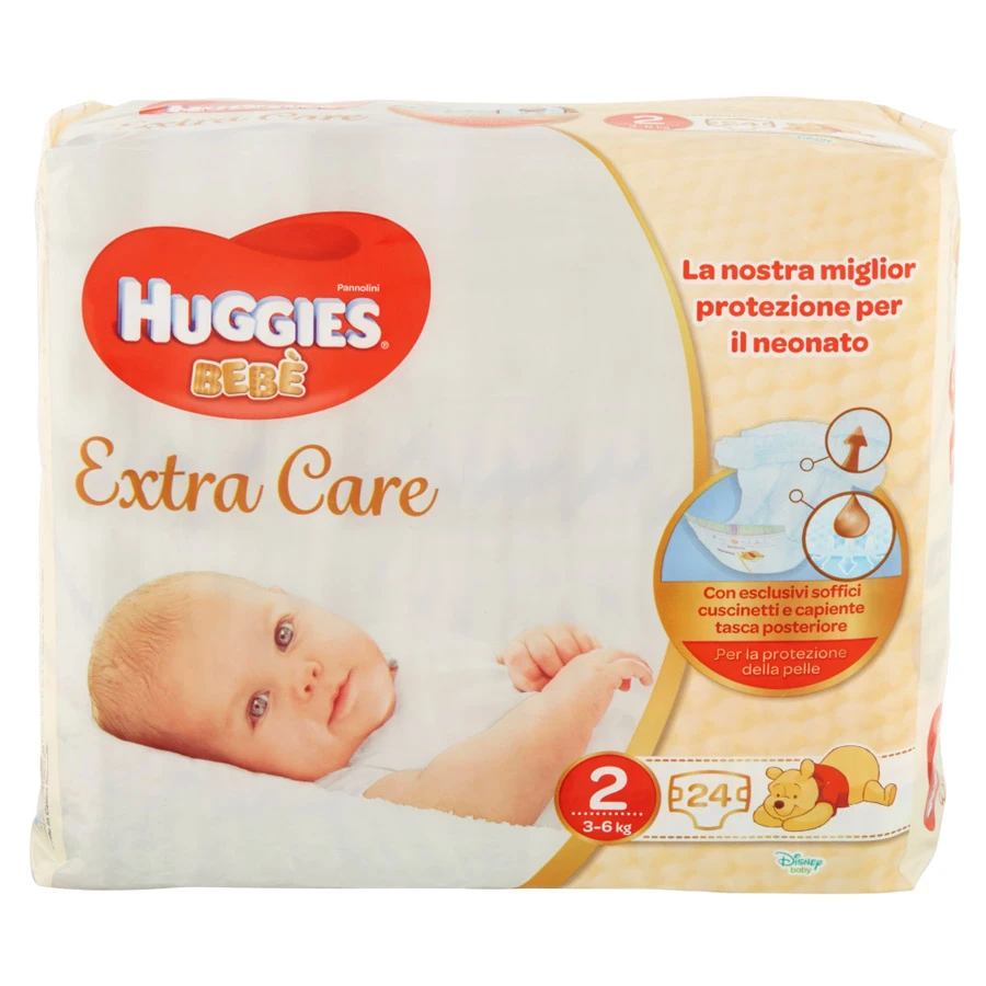 Huggies Pannolini Extra Care Mini 2 24 pezzi. Huggies Extra Care Bebè assorbe la pupù liquida grazie agli esclusivi cuscinetti.