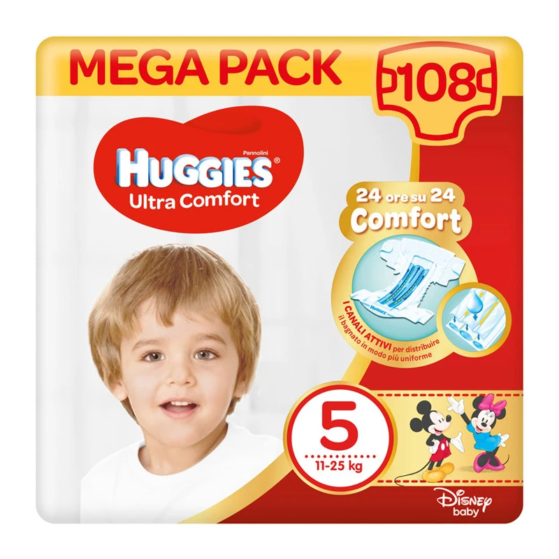 Huggies Pannolini Ultra Comfort Mega Pack 5 – 108 pezzi. Comfort 24 ore su 24 per i bambini con Huggies Ultra Comfort. I canali attivi distribuiscono il bagnato il modo uniforme. I bambini sono liberi di muoversi senza effetto mucchio. Inoltre la banda elastica e la forma anatomica aiutano a mantenere una ottima vestibilità.