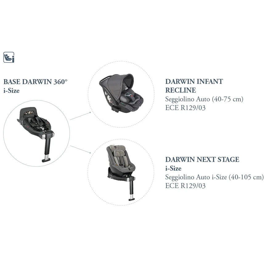 Inglesina Base Auto Girevole Darwin 360° i-Size per Seggiolino Auto Darwin Infant, Darwin Infant Recline e Darwin Next Stage i-Size consente di seguire nella crescita il tuo bambino fino ai 4 anni. La base auto Darwin 360° permette di installare in maniera sicura e stabile gli ovetti Darwin Infant e Darwin Infant Recline per i neonati da 0 a 15 mesi (installabili solo in senso contrario di marcia) e il seggiolino Darwin Next Stage i-Size per seguire il bambino nella crescita fino ai 4 anni. La base Darwin 360° è dotata di ganci Isofix che garantiscono una connessione sicura con il sedile dell’auto e di piede di supporto che raccoglie l’onda d’urto in caso di incidente. Inoltre la base auto Inglesina è provvista di protezione contro i rimbalzi da collisione per la massima protezione durante gli spostamenti in auto.