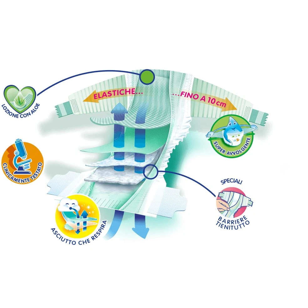 Pampers Baby Dry Midi è il pannolino che offre al tuo bambino un «ASCIUTTO CHE RESPIRA»: grazie alla sua struttura super assorbente e materiali traspiranti, blocca il bagnato lontano dalla pelle mentre lascia passare liberamente l’aria al suo interno per una naturale traspirabilità. Così la sua pelle è protetta, asciutta e libera di respirare.