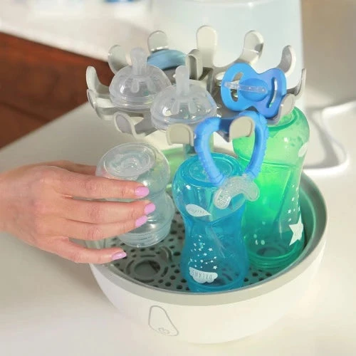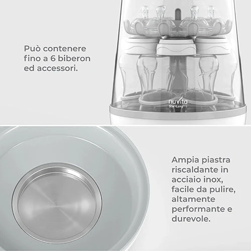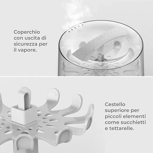 Il cestello superiore rimovibile, ideale per sterilizzare gli articoli di piccole dimensioni come succhietti, tettarelle e ghiere ed il supporto per i biberon in vetro, anch’esso utilizzabile a convenienza, permettono di modulare lo sterilizzatore in base alle proprie esigenze, favorendo un ciclo di sterilizzazione sempre ottimale.