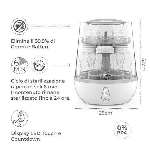 Lo sterilizzatore Nuvita SteriEasy Pro è privo di BPA ed utilizza il calore intenso del vapore per sterilizzare in maniera naturale ed efficace i biberon e gli altri elementi, eliminando il 99,9% dei germi e batteri senza ricorrere all’utilizzo di prodotti chimici.