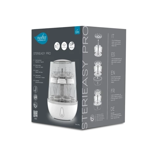Ultra veloce e sicuro, lo sterilizzatore a vapore digitale SteriEasy Pro sterilizza fino a 6 biberon, tiralatte ed accessori in soli 6 minuti mantenendo il contenuto sterile fino a 24 ore.